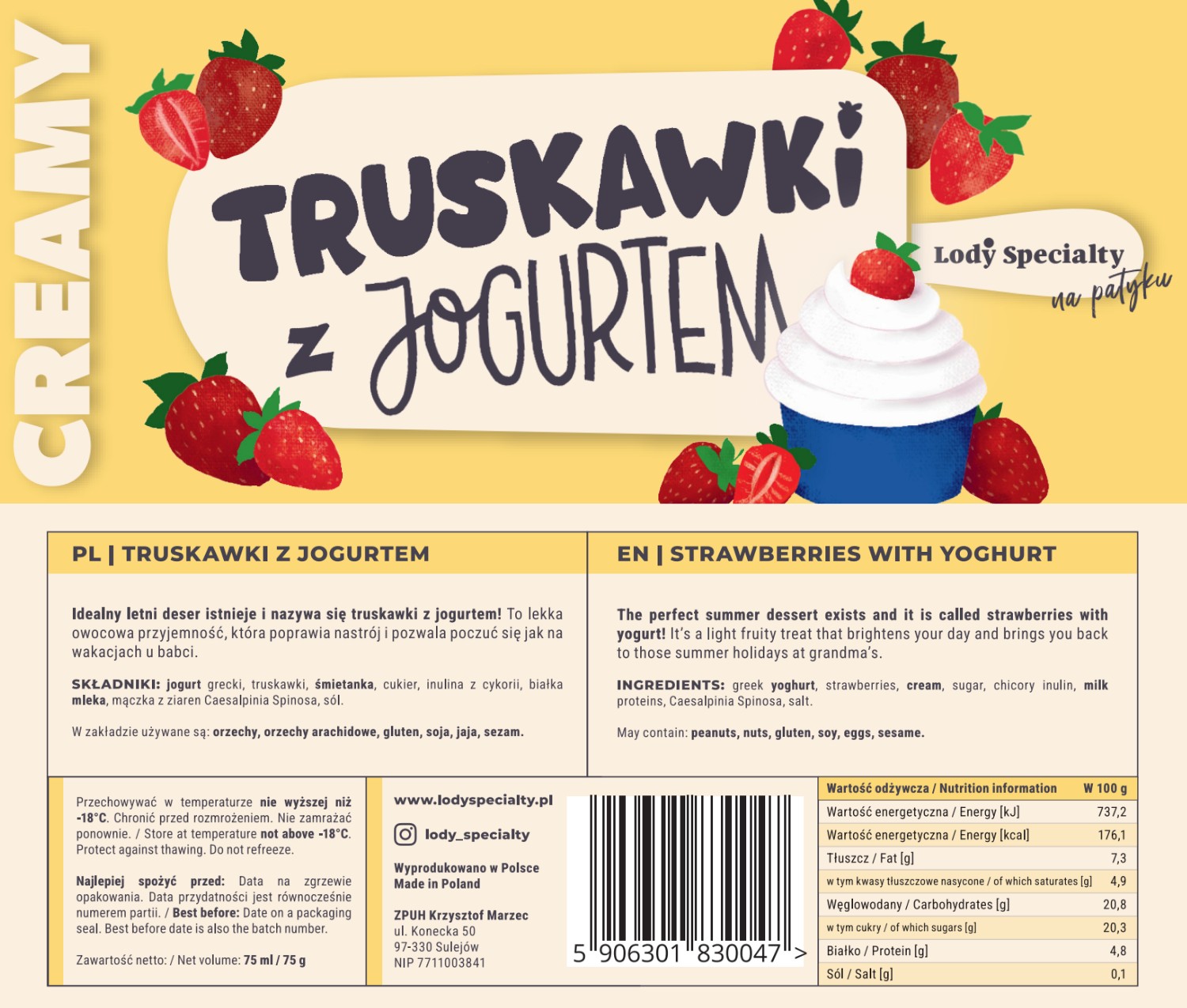 Składniki: jogurt grecki, truskawki, śmietanka, cukier, inulina z cykorii, białka mleka, mączka z ziaren Caesalpinia Spinosa, sól