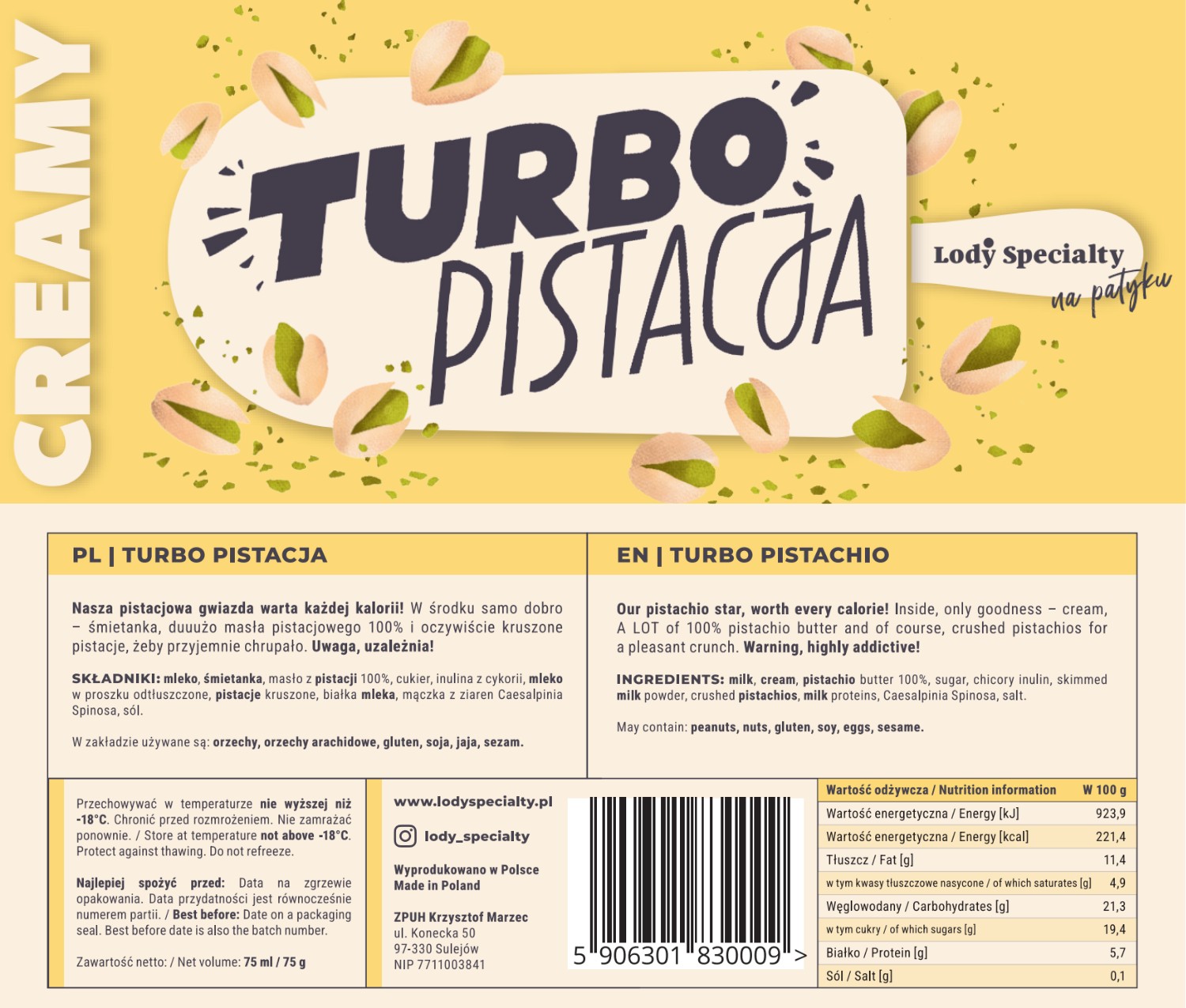 Nasza pistacjowa gwiazda warta każdej kalorii! W środku samo dobro – śmietanka, duuużo masła pistacjowego 100% i oczywiście kruszone pistacje, żeby przyjemnie chrupało. Uwaga, uzależnia!